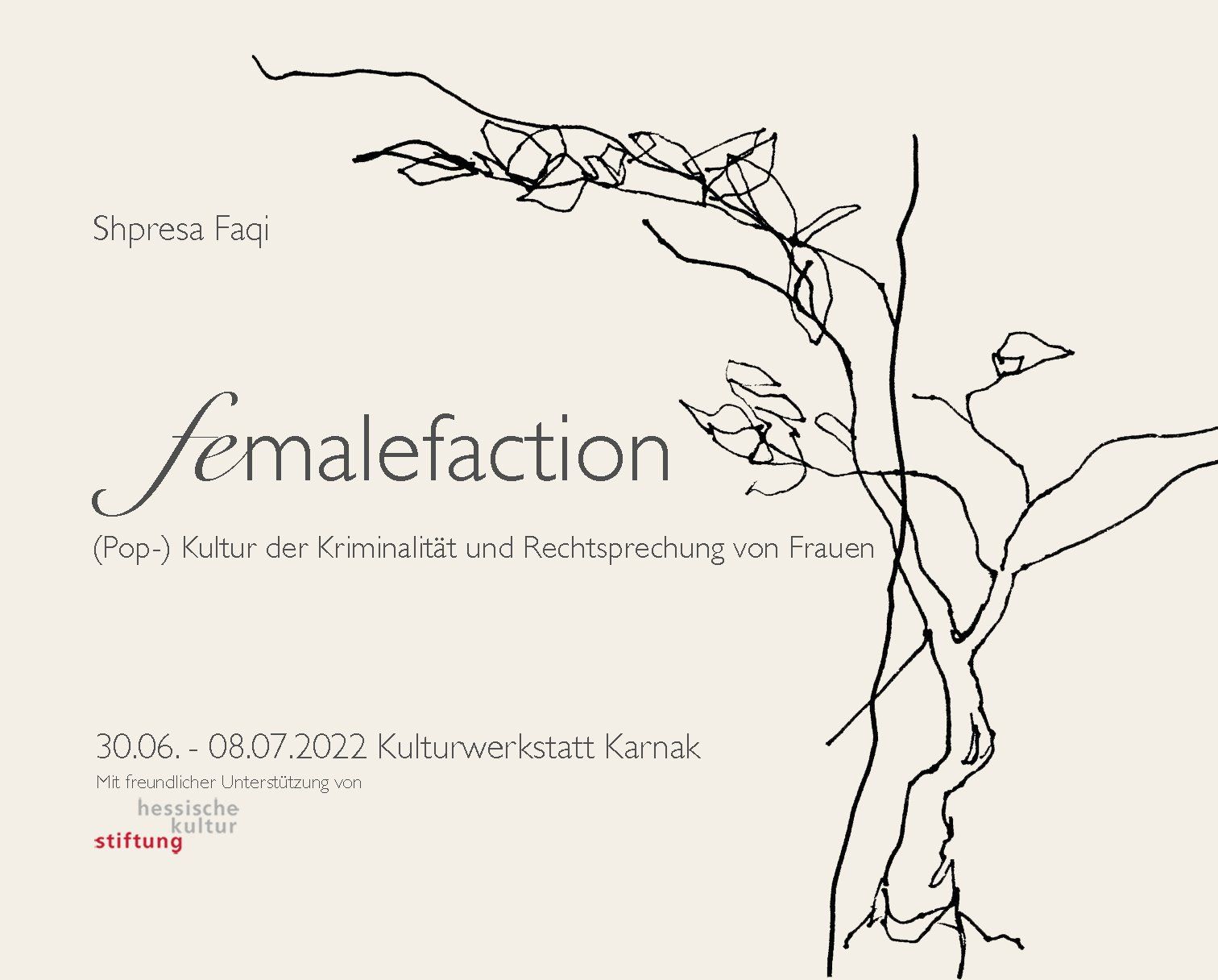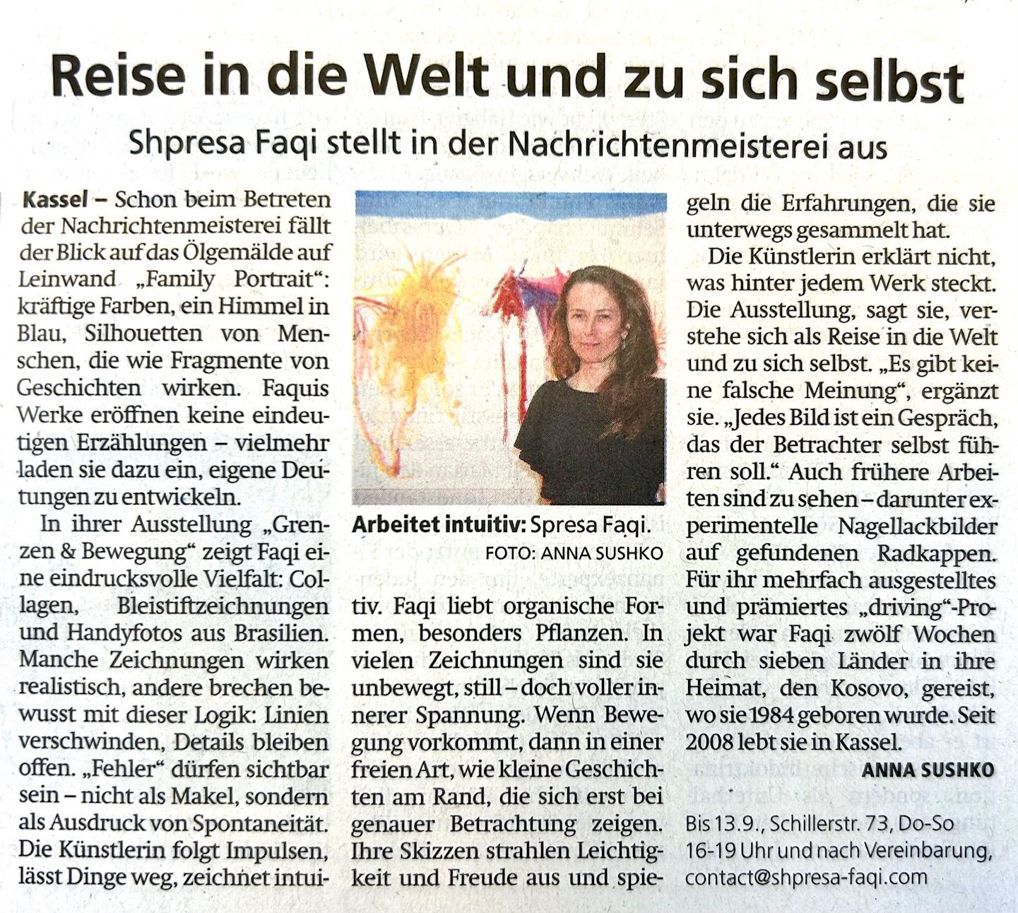 She created installations in cooperation with the Kassler Kunstverein, Artists Unlimited, the Kollegienkirche Salzburg (A) and the H.D.L.U. in Zagreb (HR). Faqi's works have also been shown at the Historical Museum of Bosnia and Herzegovina, the National Gallery of Kosovo and the Embassy of the Republic of Kosovo in Berlin. They will be are now on display at the Nachrichtenmeisterei.