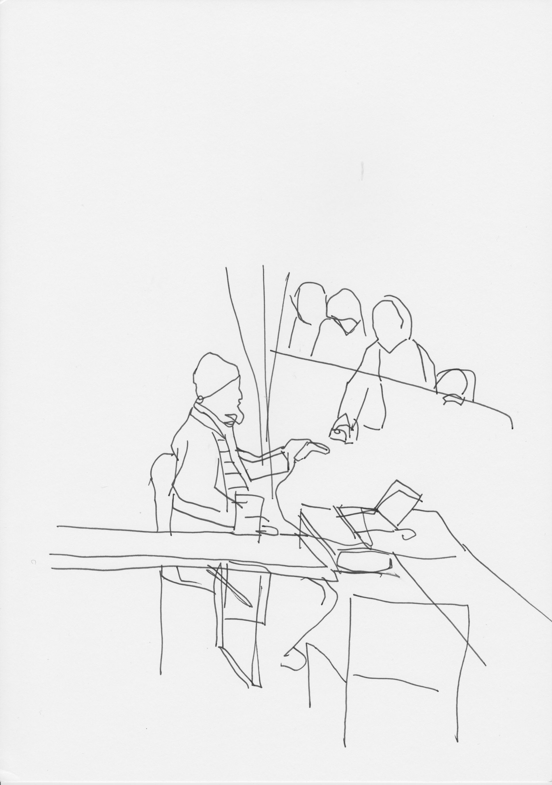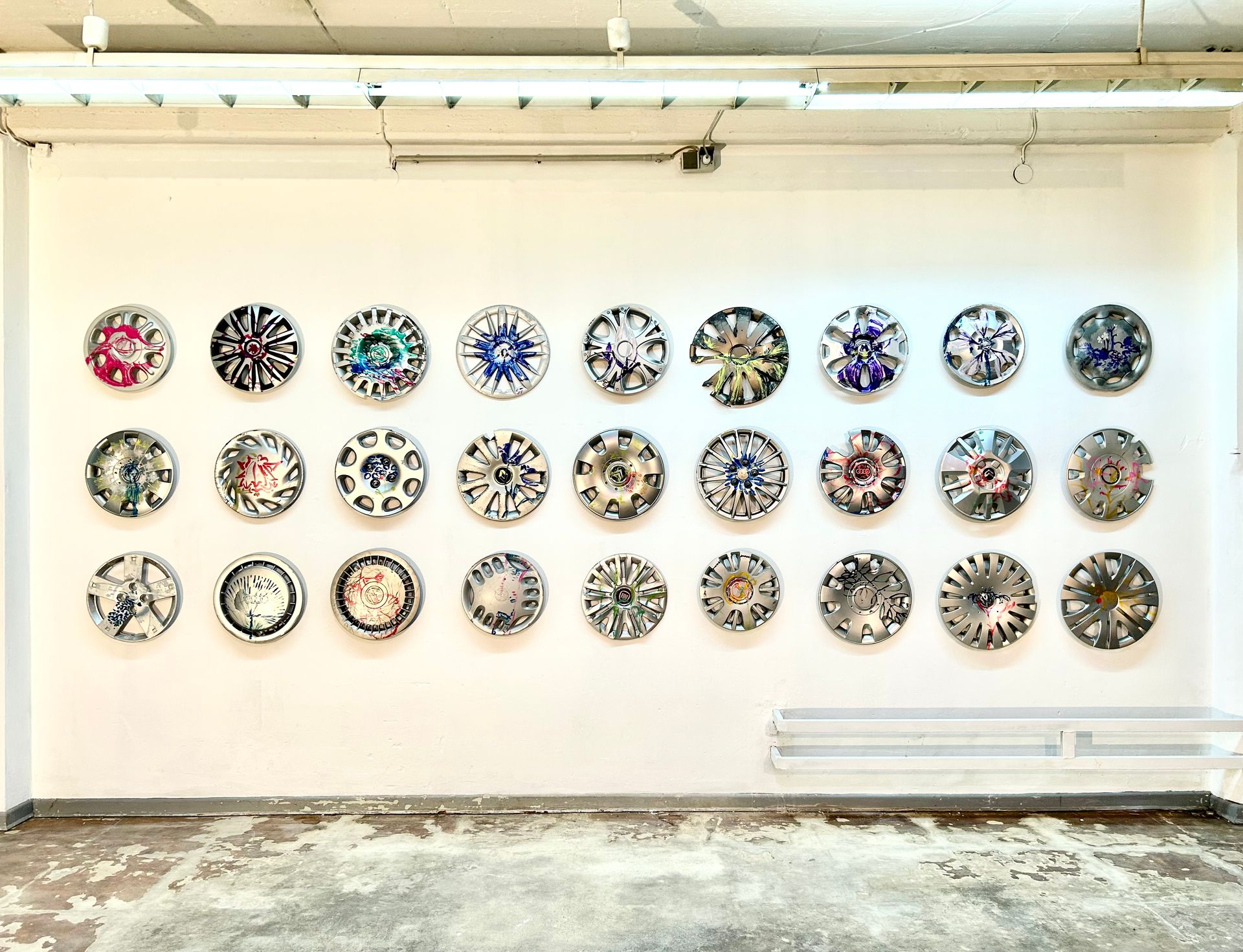 In artistic travel projects, Shpresa Faqi explores living spaces and movement from a variety of perspectives: flight and privilege, cultural encounters, and internal and external boundaries. She documents places and portrays people with drawings that become projector installations in public spaces, creating floral nail polish paintings on found hubcaps and collages from cell phone photographs meet space-related oil painting.